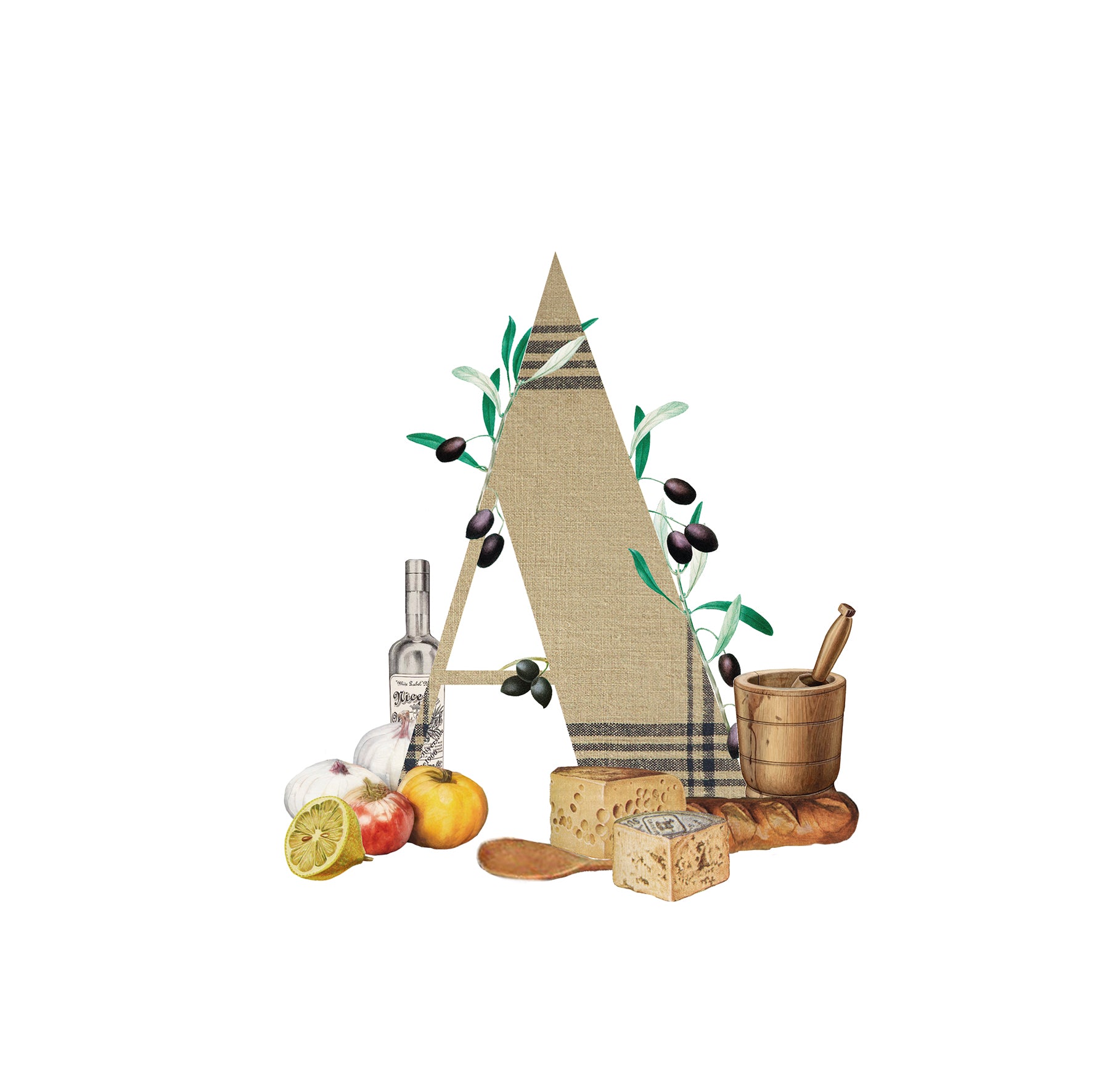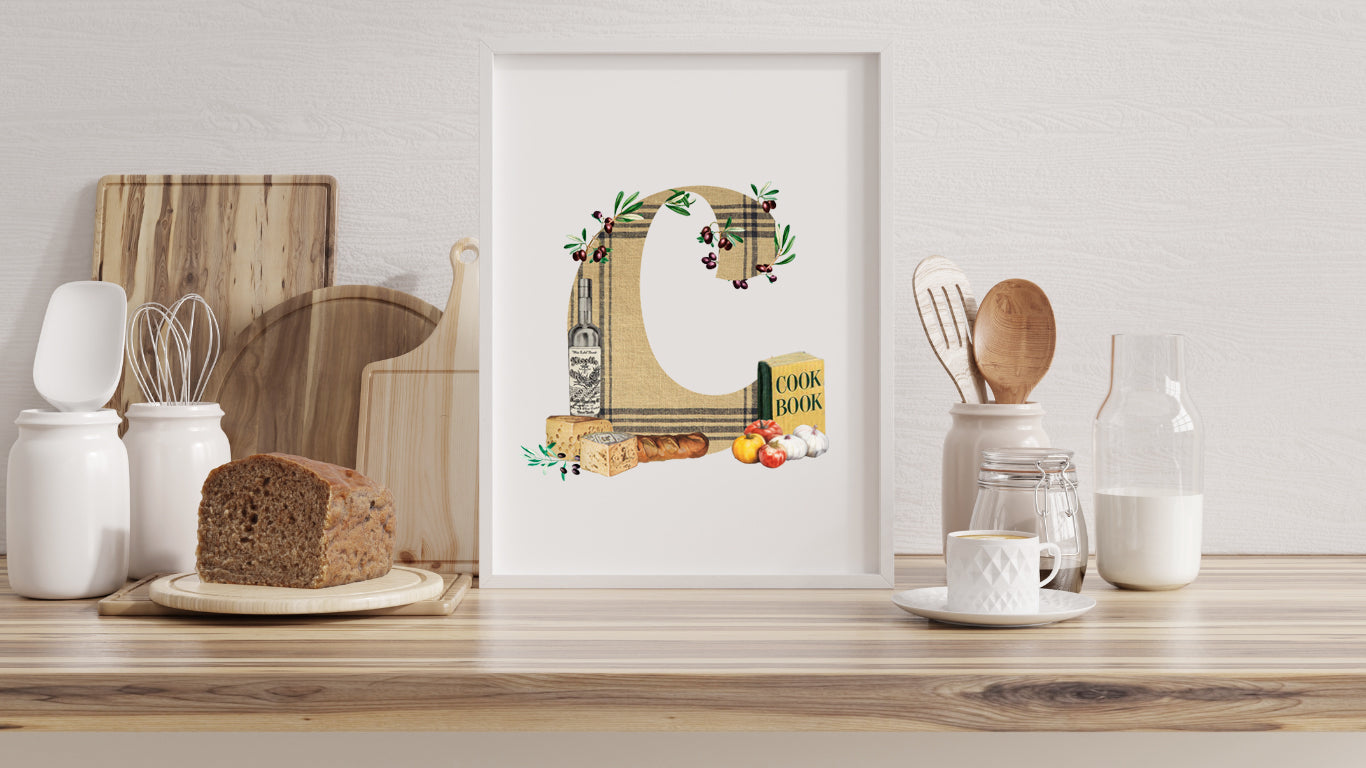 Láminas de diseño exclusivo que combinan collages de ilustraciones vintage de cocina y plantas con elegantes letras personalizadas.