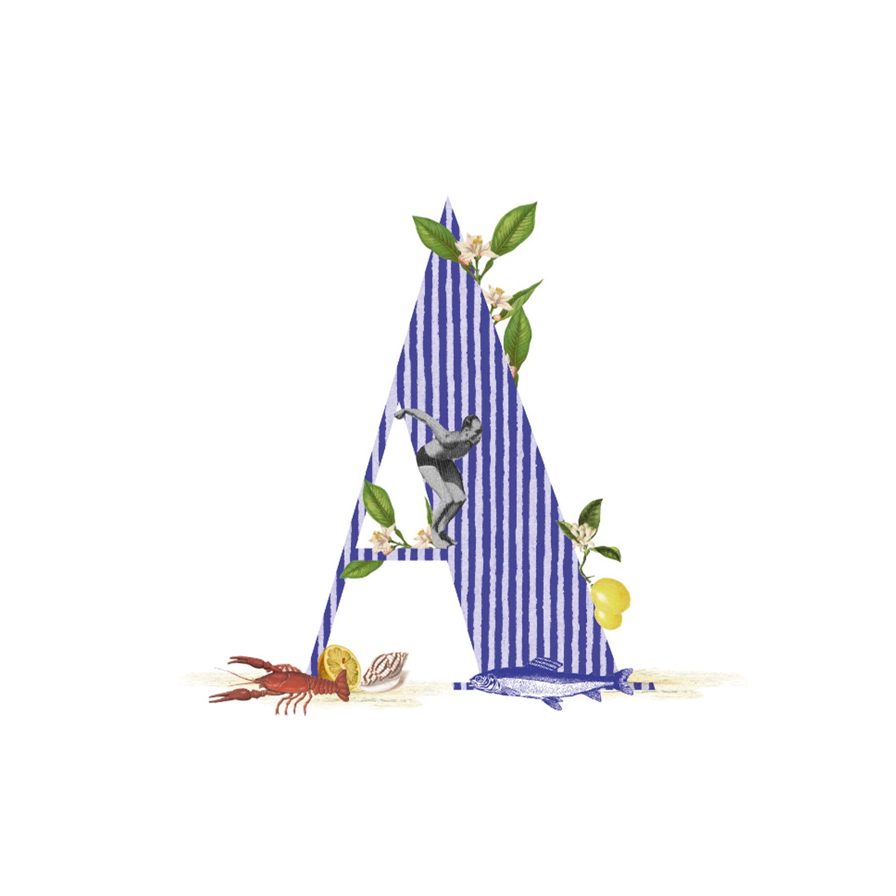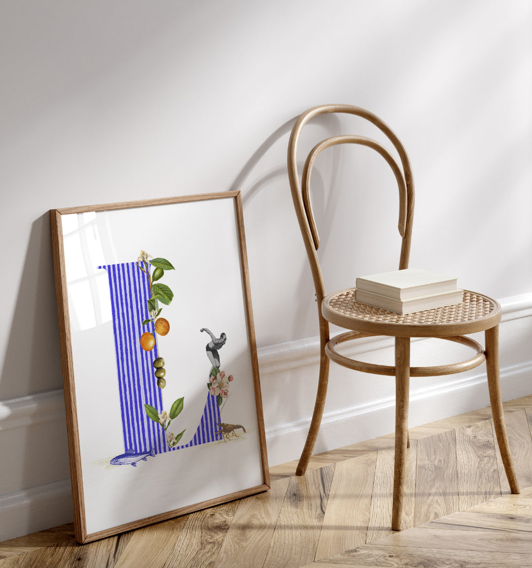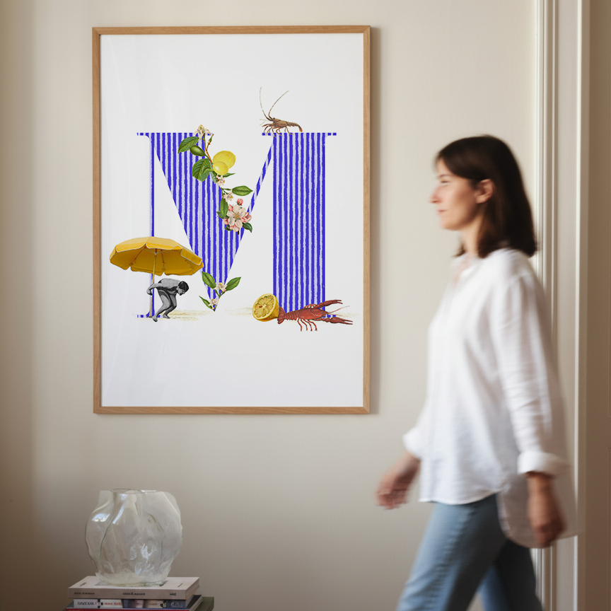 Láminas de diseño exclusivo que combinan collages de ilustraciones vintage y letras personalizadas en temática mediterránea.