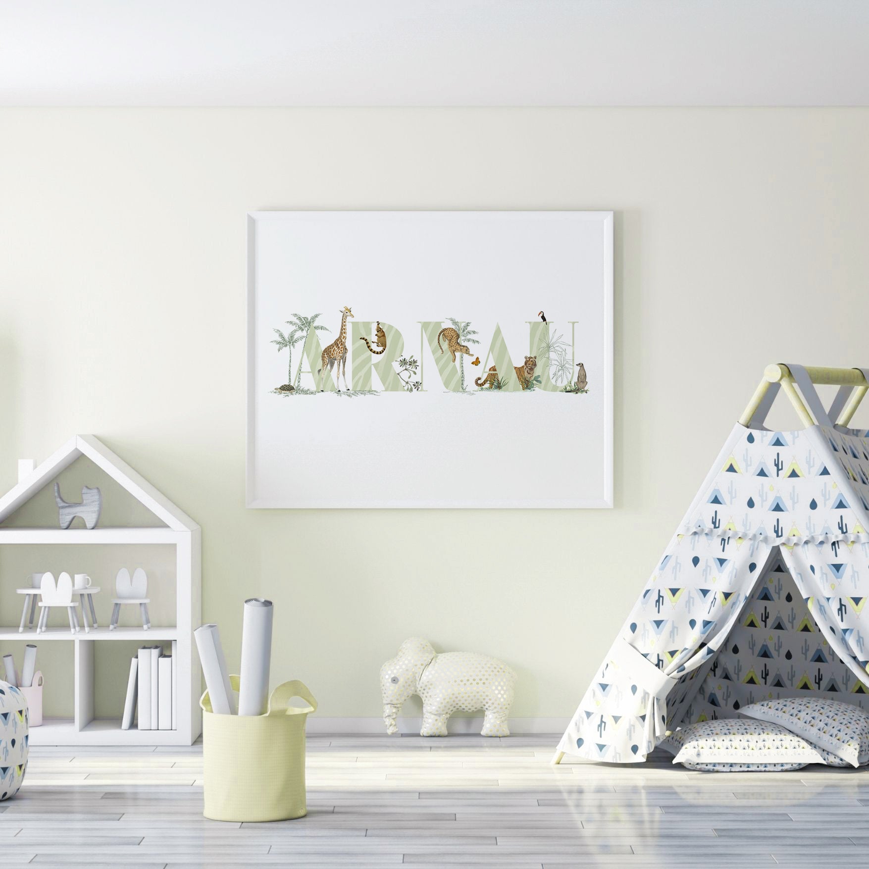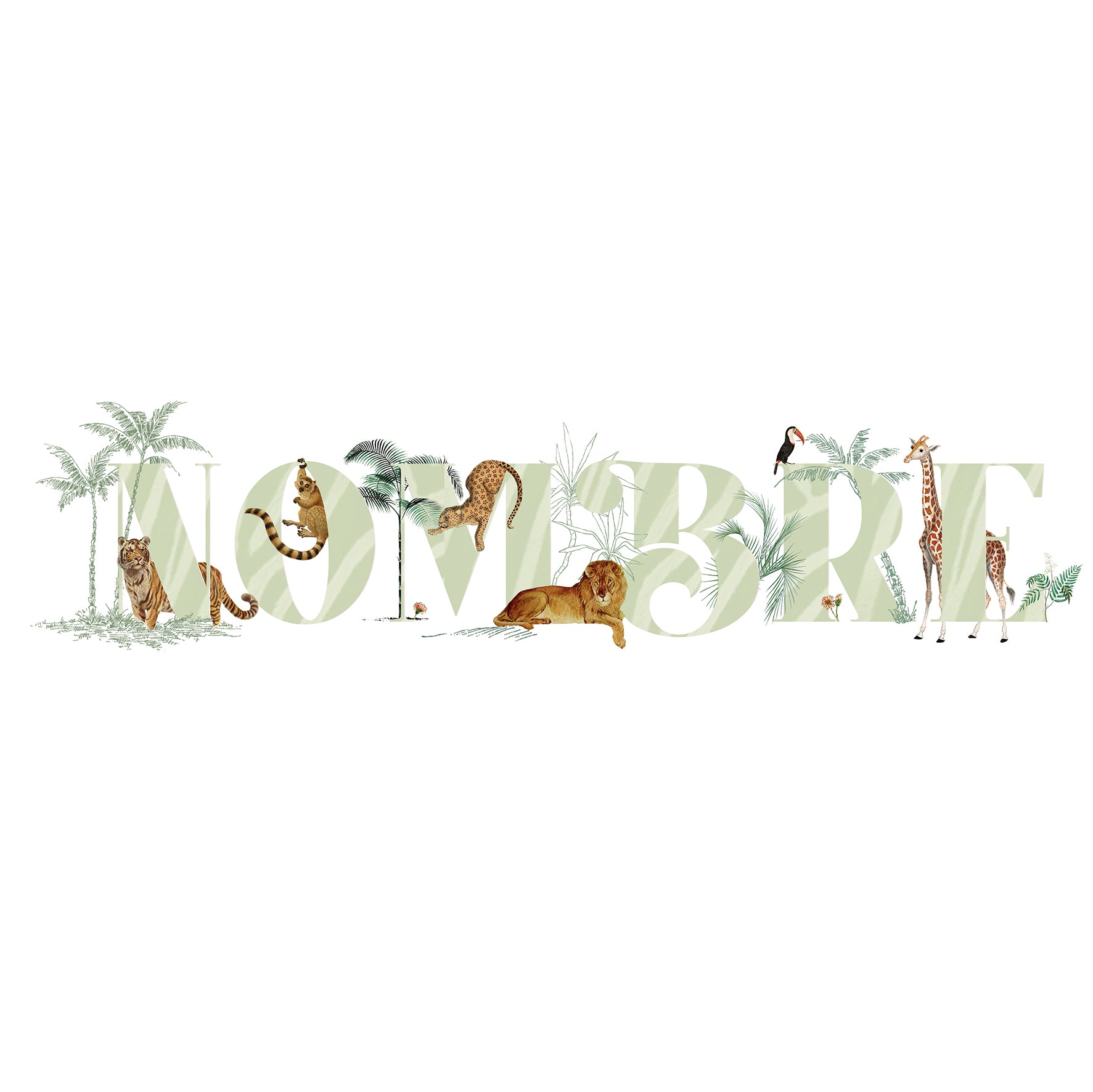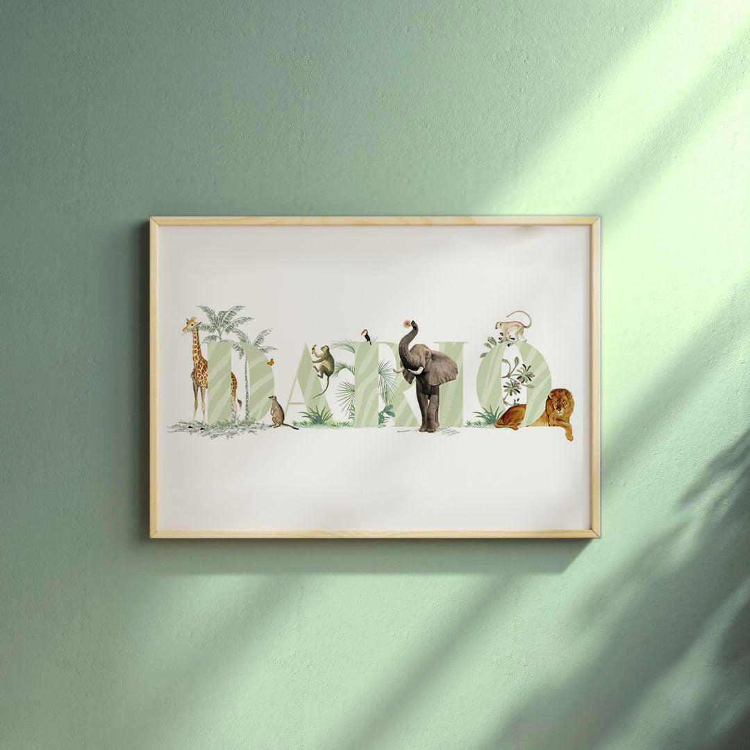 Láminas de diseño exclusivo que combinan collages de ilustraciones vintage y el nombre que escojas personalizado en temática de animales de la selva.