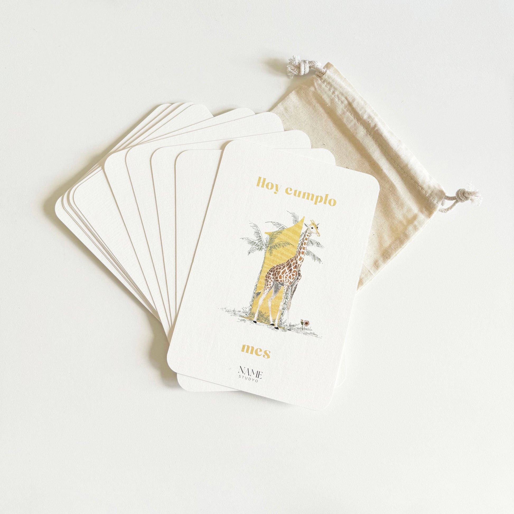 Pack de láminas cumplemes inspiradas en temática selva. El pack incluye 13 láminas, donde cada mes tiene un animal único.